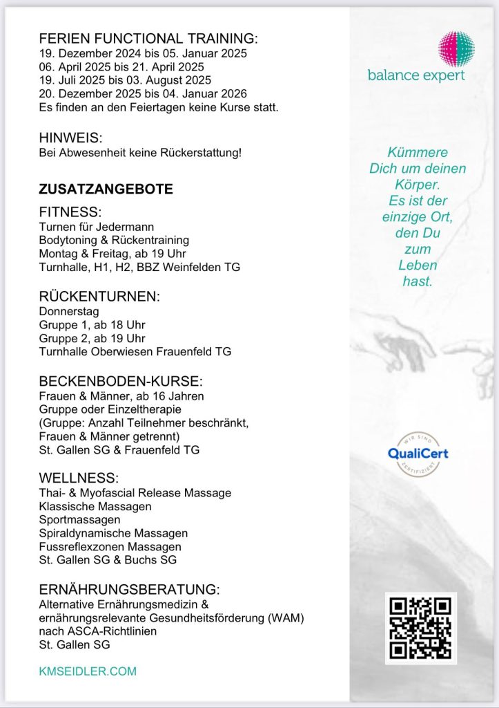 Haben wir Ihr Interesse für mehr Bewegung – mit einer grossen Portion Spass dabei – geweckt? Entdecken Sie Ihre körperlichen Möglichkeiten im Alltag und im Leben. Ihre Gesundheit ist Ihr wichtigster Termin. Rufen Sie uns an – M +41 76 803 91 31.